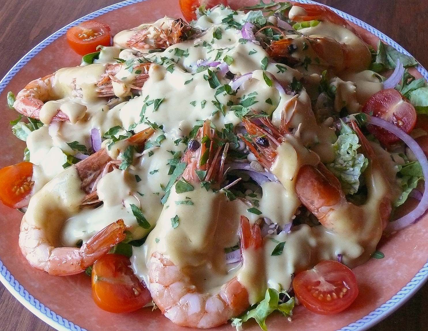 Lettuce, onions, cheese, fried bacon, dried fruits and nuts, with sweet and sour dressingLettuce,onions,seeds,prawns with mustard and honey dressing