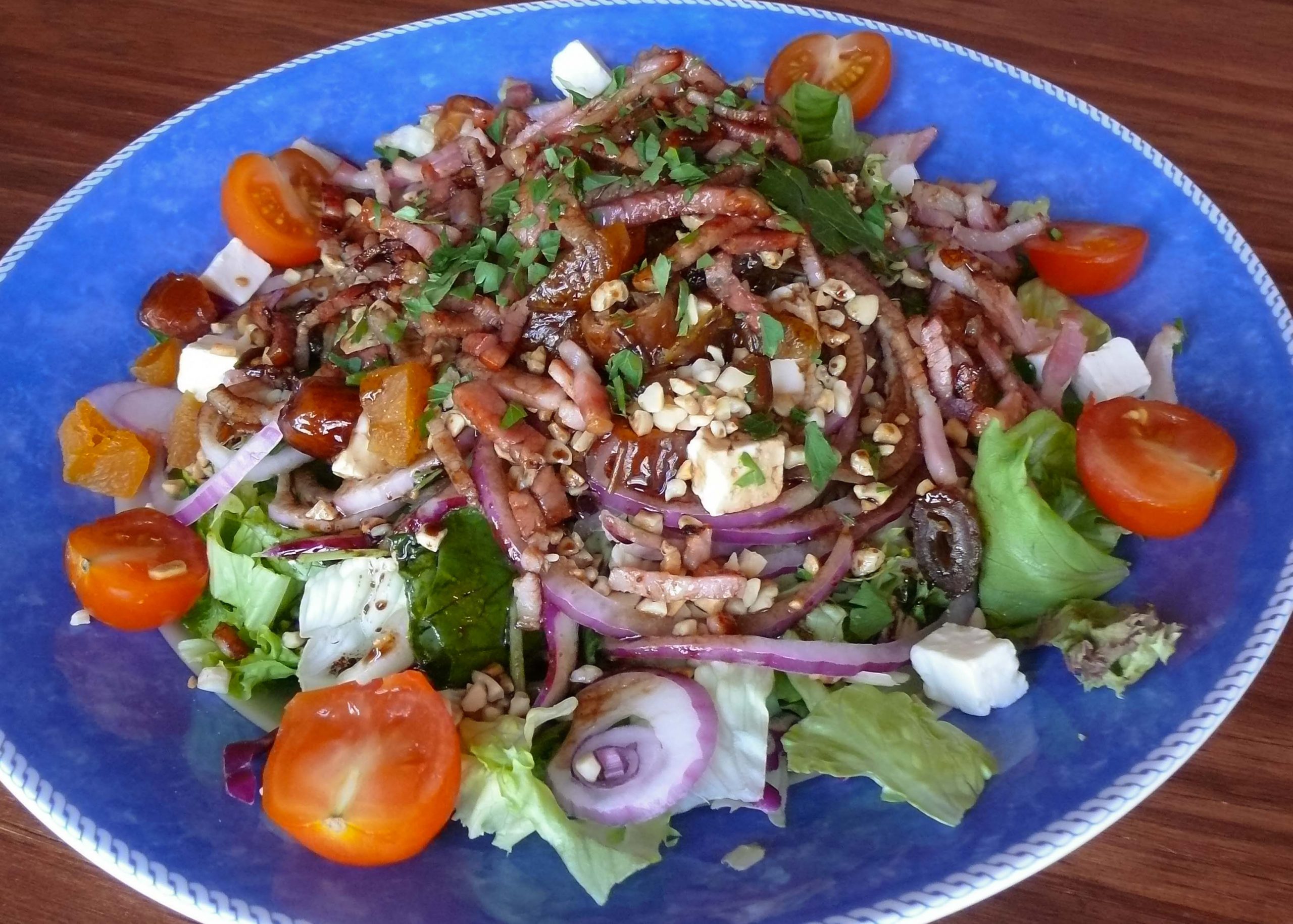 Lechuga variada, frutos secos, queso feta, beicon, cebolla morada y crema de balsámicoLechuga variada, cebolla morada, langostinos, semillas y aliño de mostaza y miel